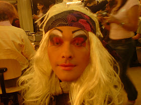 'Time for the extravaganza," Dove cried, and before I could sit up, I had been swept into Ambrosia's manly arms and carried to a chair in front of a large mirror, ringed with lights. The dressing table was covered with cremes, liners and powders of all colors. The solidified black masque was clamped so tightly that I dared not